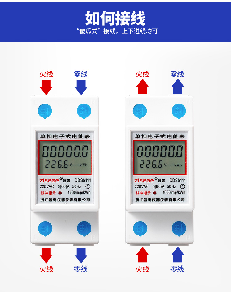 計度器顯累計用電量,單位為kWh,數值顯示位數為6位,小數位1位。電能表使用高亮、長壽命LED作為指示燈;