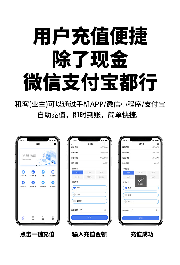 本公司DDSY6111/DDZY6111家用WiFi遠程智能電表與本公司遠程抄表系統和手機APP配套使用,遠程抄表管理系統具有實時抄表、定時抄表外,還提供了設備管理功能,如告警、余額短信通知、遠程充值、手機抄表、手機查詢、手機充值、預付費、后付費、自助充值機充值、遠程拉合閘、各種查詢報表、統計報表下載等功能。